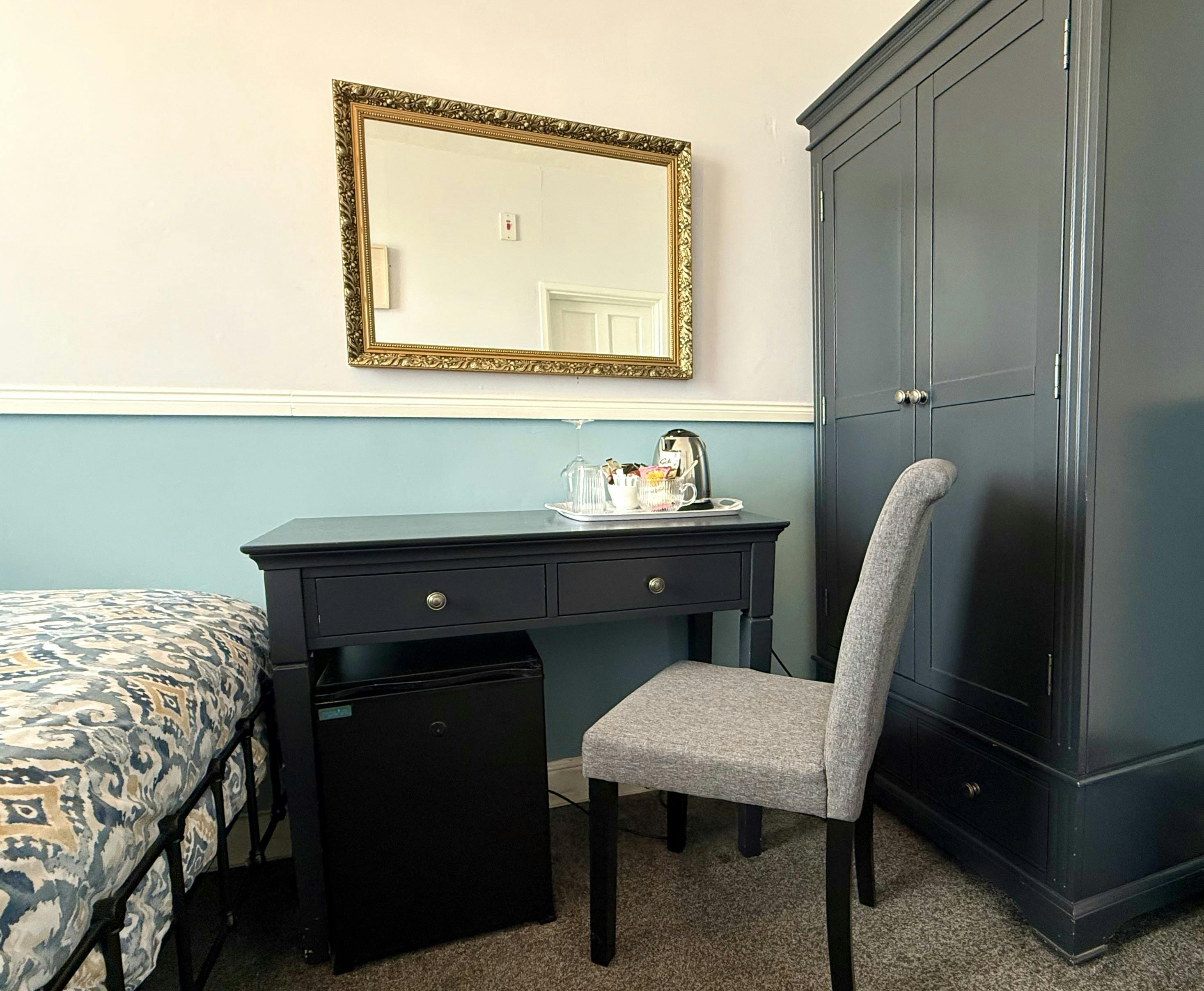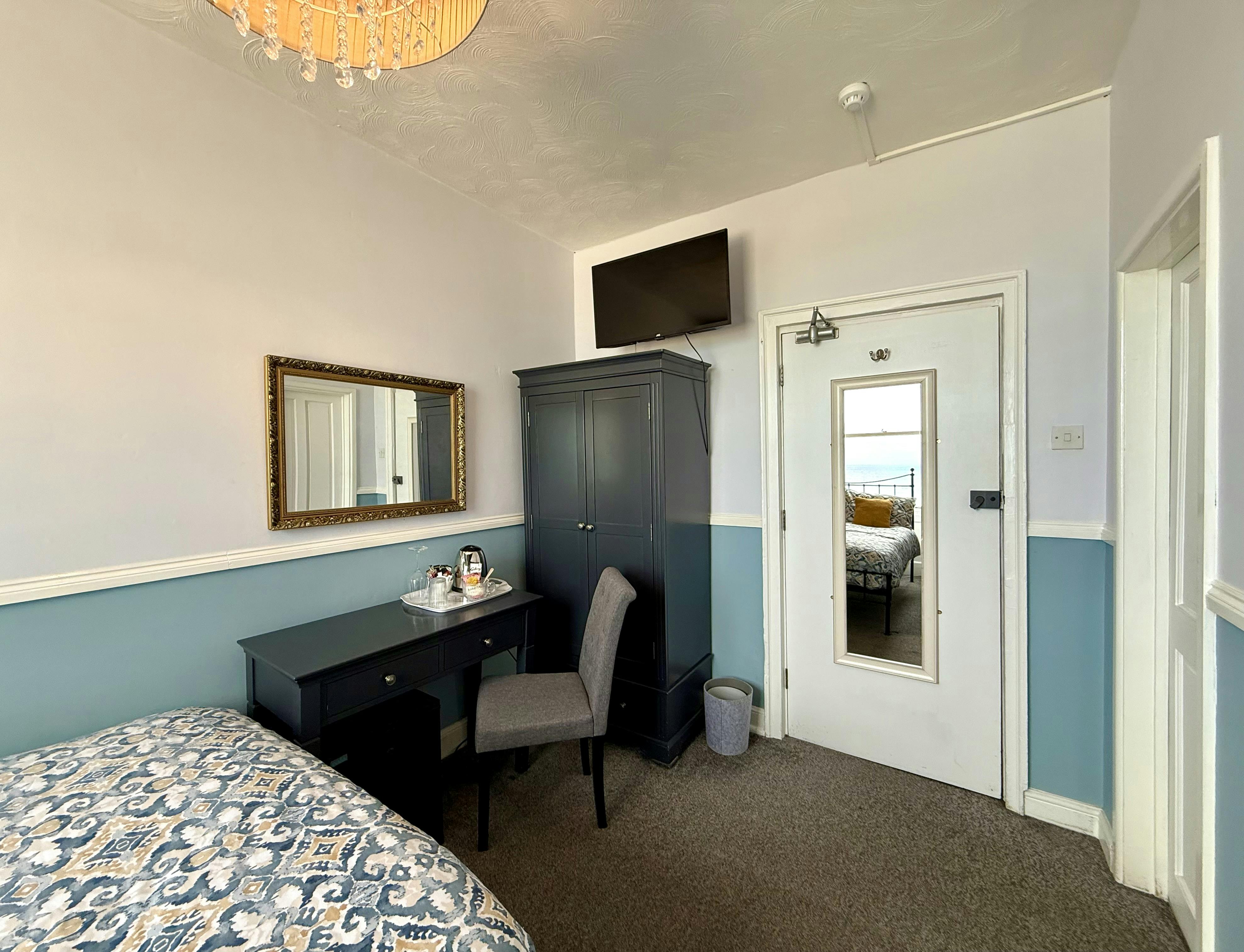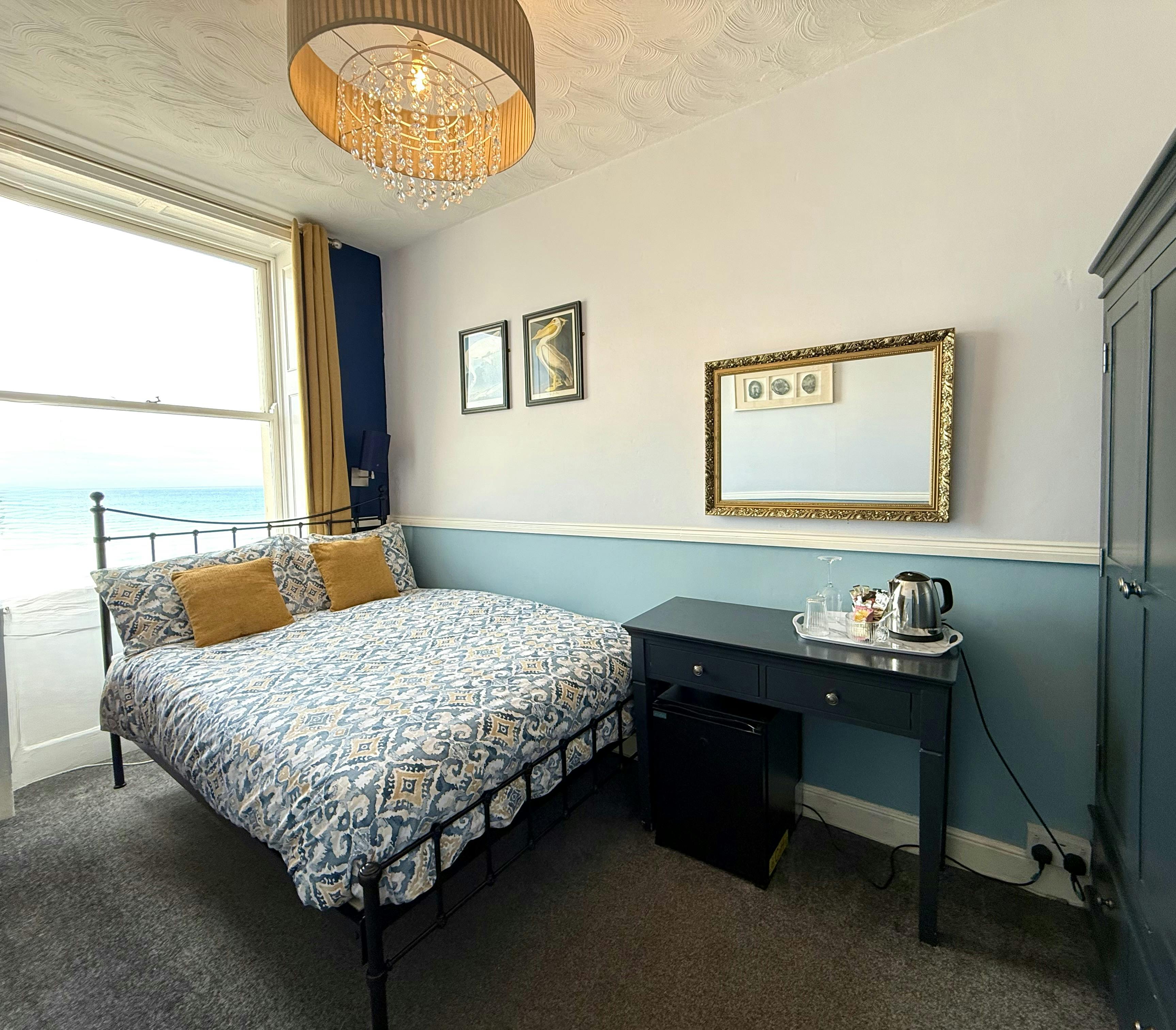 A comfortable sea-view room with a double bed, Freeview TV, mini fridge, fan, tea & coffee making facilities and an en-suite shower room with towels & toiletries.